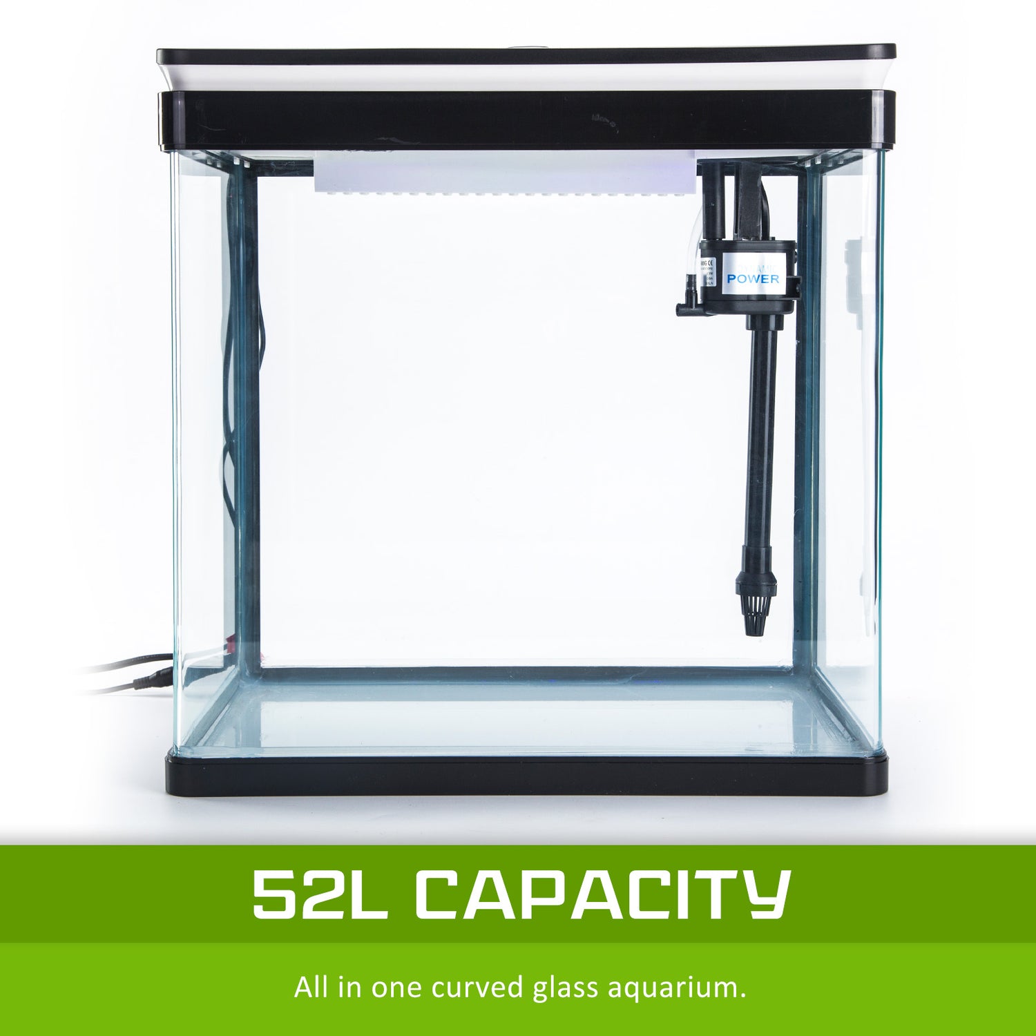 Specifications: Capacity: 52L | Dimensions: 50cm L x 30cm W x 45cm H | Weight: 10.5kg | Glass: 4mm curved | RGB LED: 7W (373 x 40 x 40mm) | Filter: 8W 500L/hr | Hinged hood | Fresh & saltwater