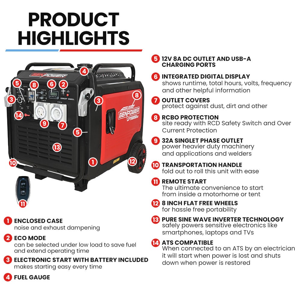 GENPOWER 8.5kW Peak 8.2kW Inverter Generator - Remote Start, ATS Compatible, RCD Protection