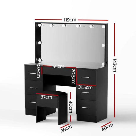 Dressing Table Black with 10 LED Bulbs & Stool - Artiss Vanity Desk