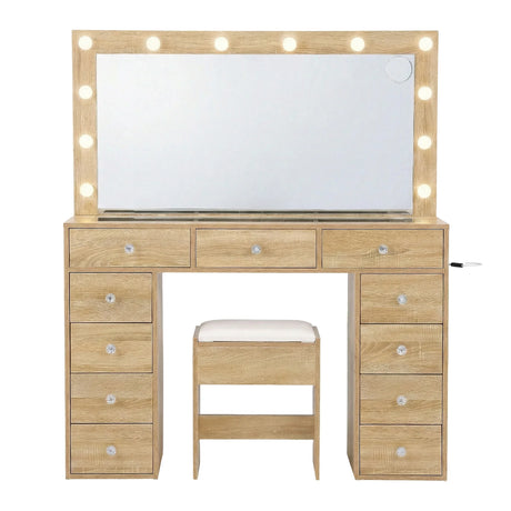 Dressing Table Wood with 12 LED Bulbs & Stool - Artiss Vanity Desk