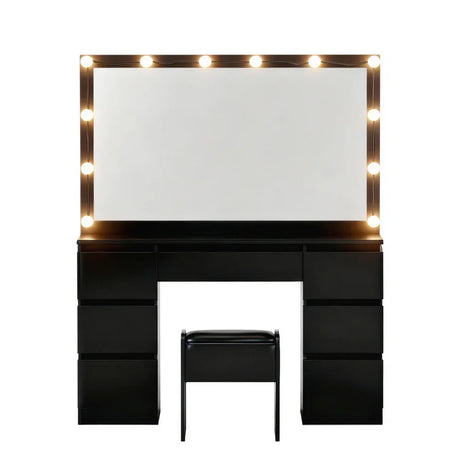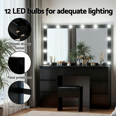 Dressing Table Black with 12 LED Bulbs & Stool - Artiss Vanity Desk