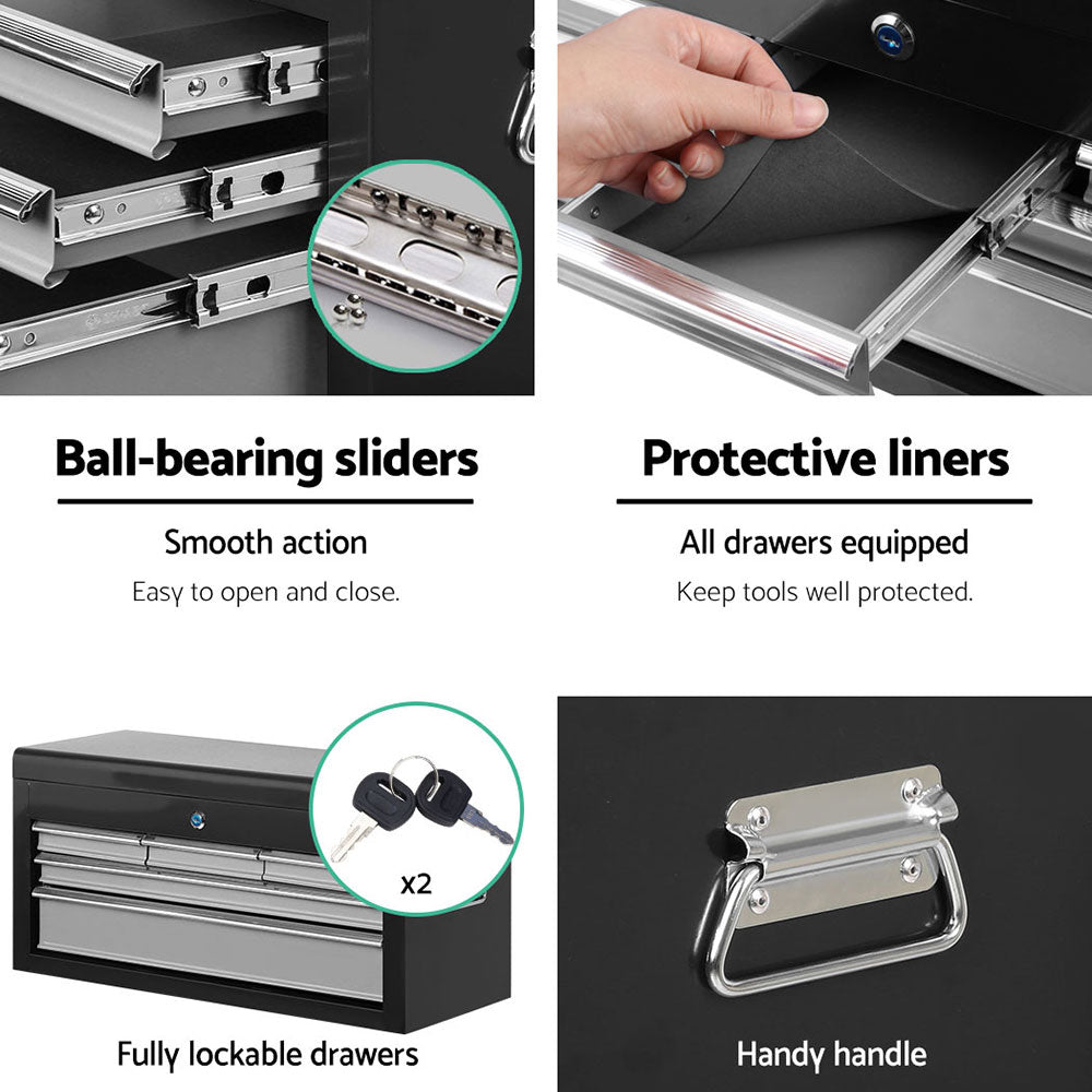 With 7 drawers distributed across the chest and trolley, this storage system provides excellent organization for your tool collection. The varying drawer sizes ensure you have the perfect storage space for everything from small hand tools and fasteners to larger power tools and equipment. Each drawer features smooth ball-bearing slides for effortless opening and closing, even when fully loaded.