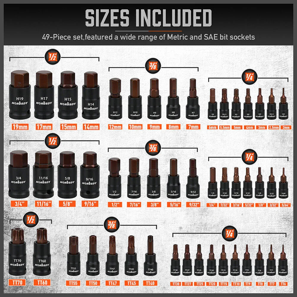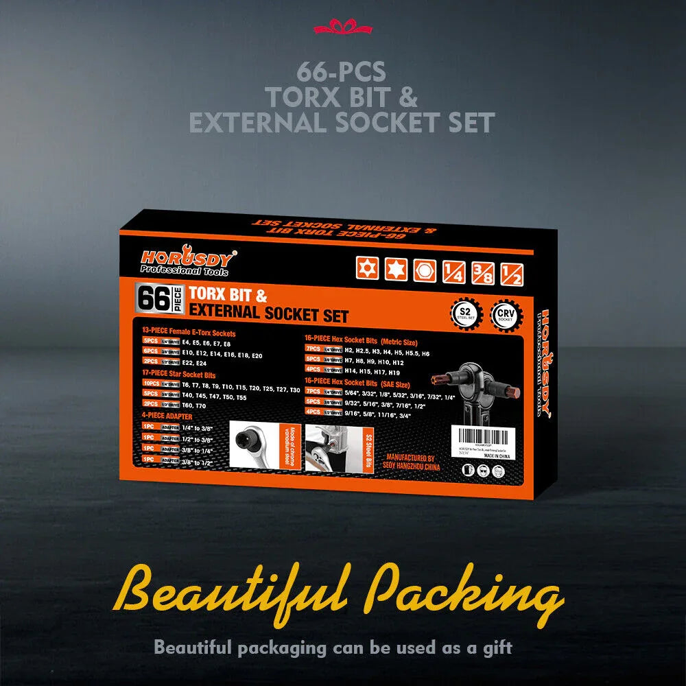 HORUSDY Torx Socket Set β Our 66-piece set provides comprehensive coverage for female and external Torx fasteners with impact adapters, perfect for modern automotive, electronic, and mechanical applications requiring specialized Torx tools.